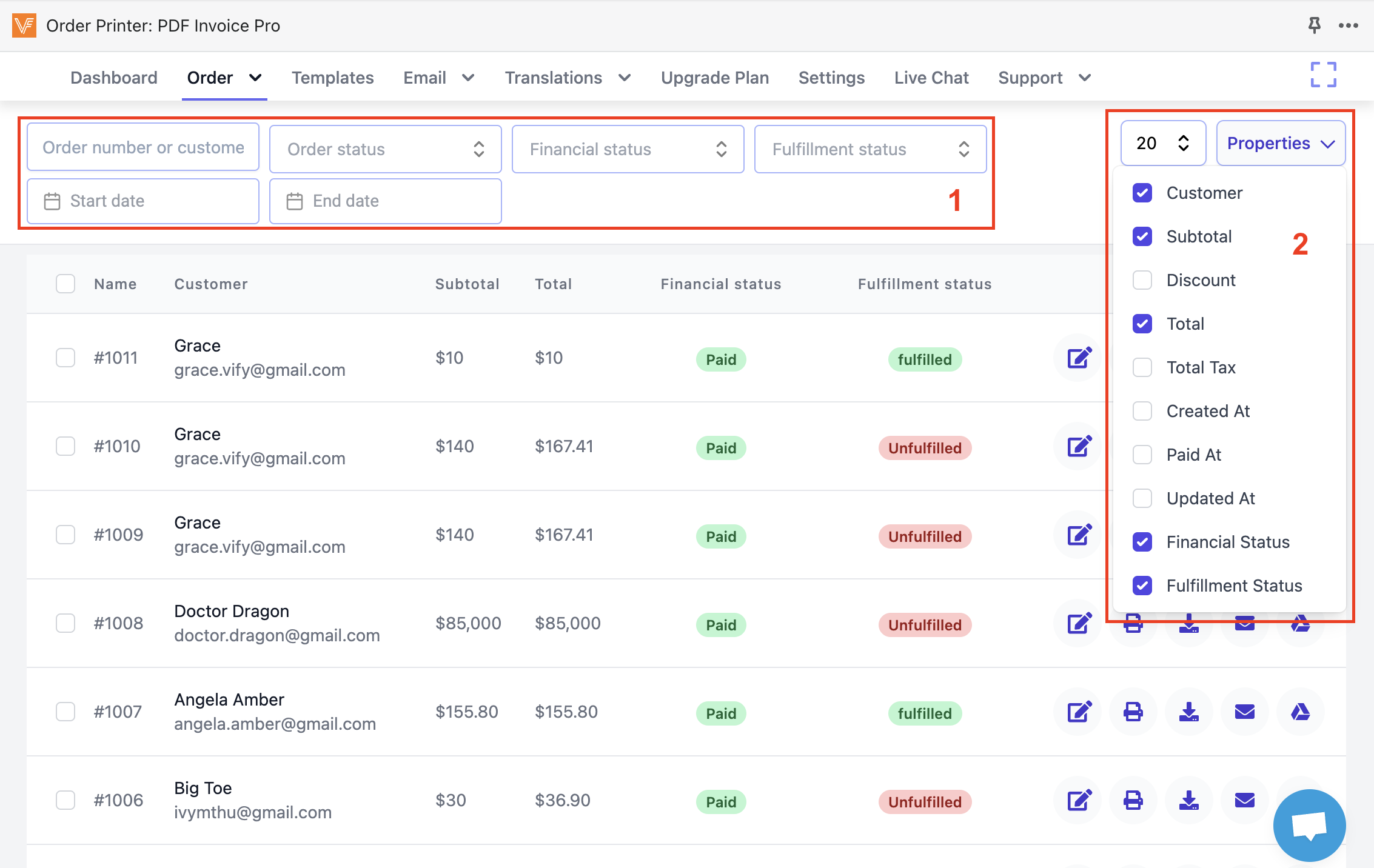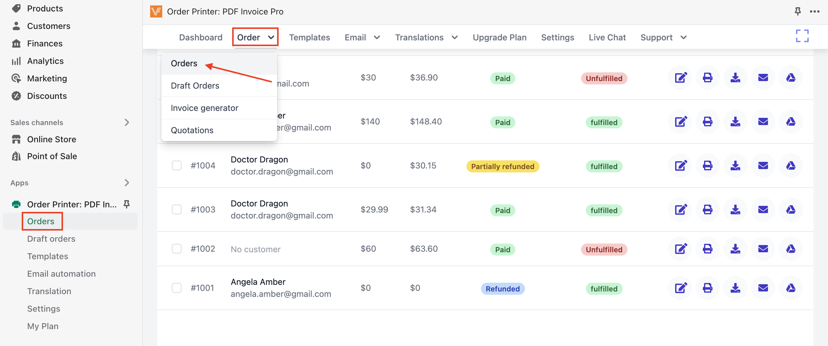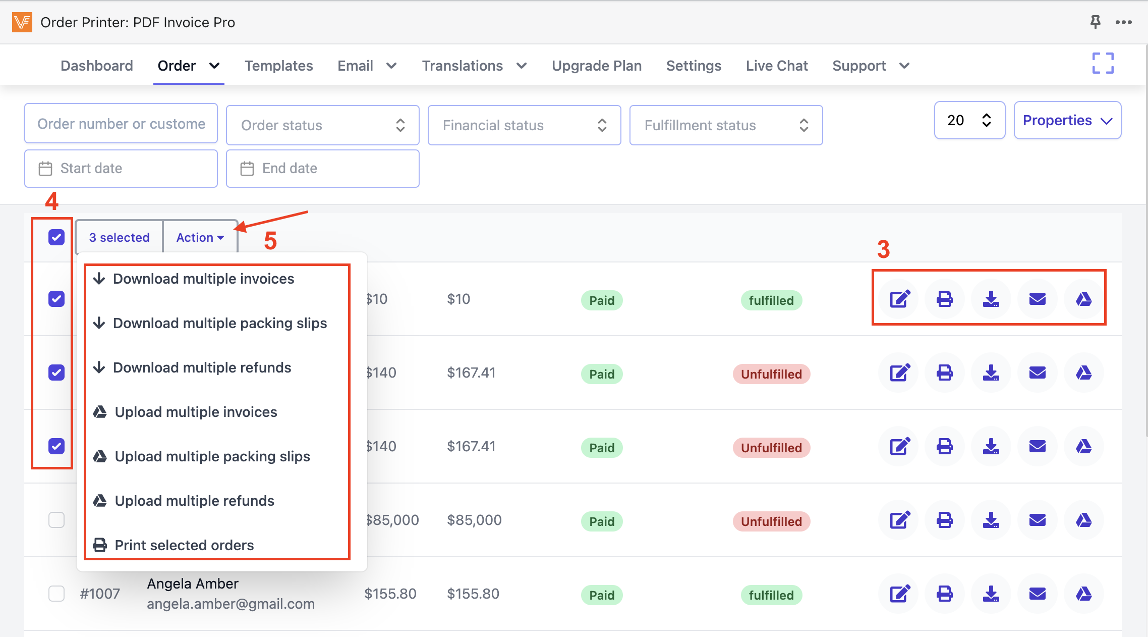 - Select action to Edit/Print/Download/Send email/Upload to GG Drive pdf file for 1 specific order. The Edit invoice feature is for paid plan only.