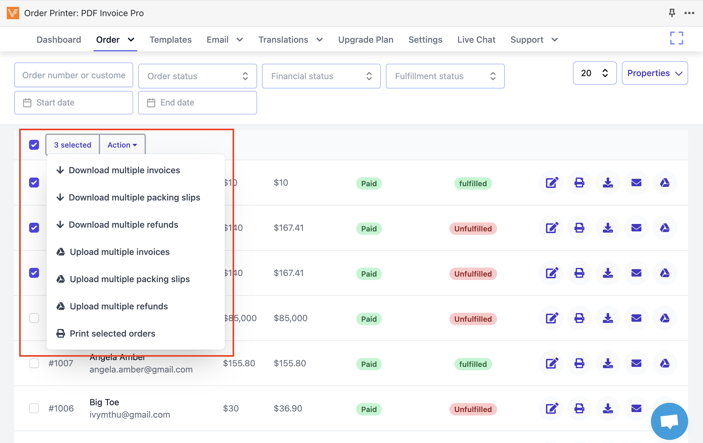 When you select multiple orders and choose "Action", you can Download those multiple PDF to your device/ Upload those to Google Drive/ Print selected orders