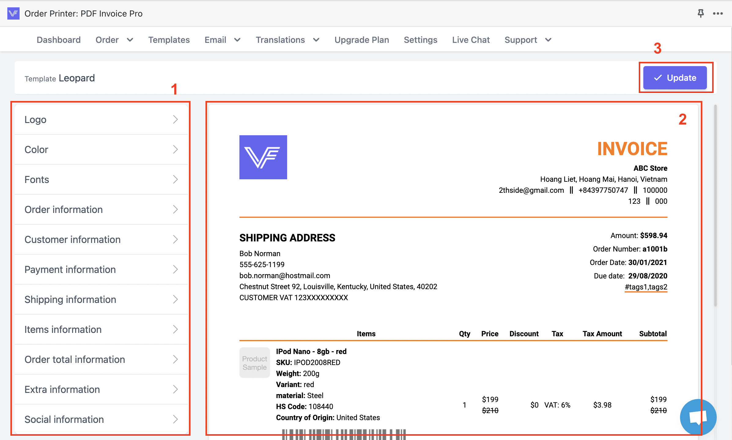 This guideline gives you information about how to edit different sections in your template for Invoice/ Packing Slip/ Refund.