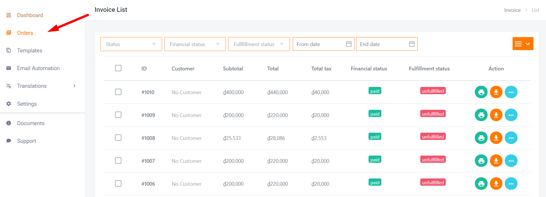 On Dashboard -> go to Orders to access orders list: