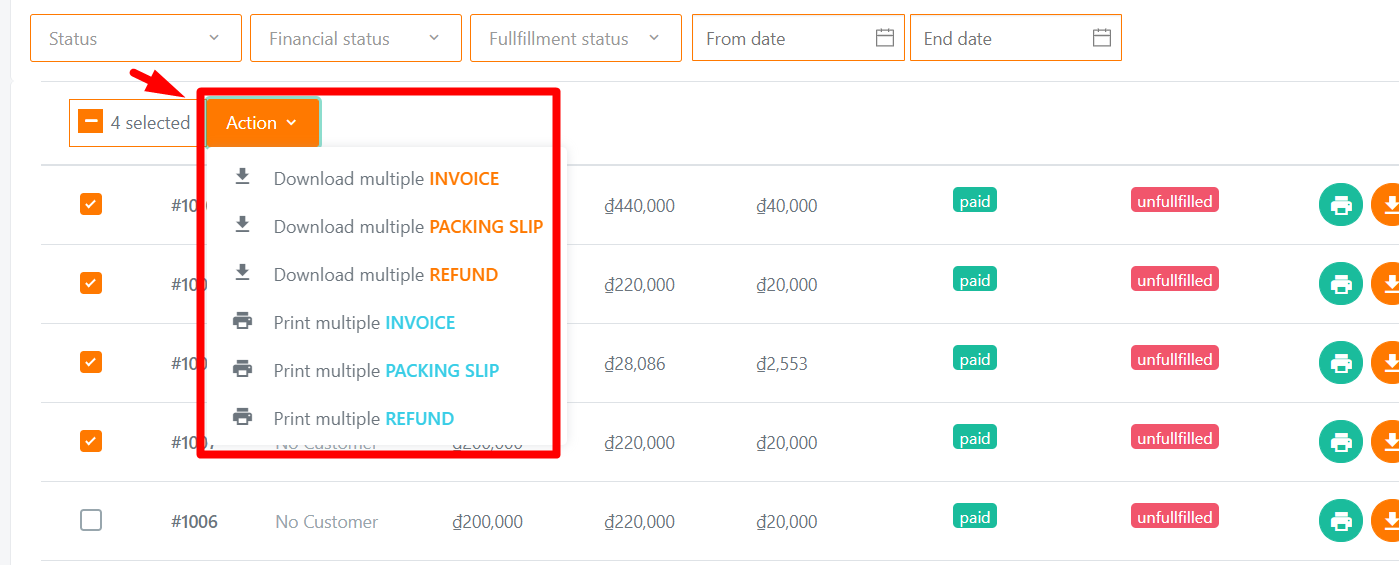 Yes! Our app supports downloading/printing multiple order invoices at once.