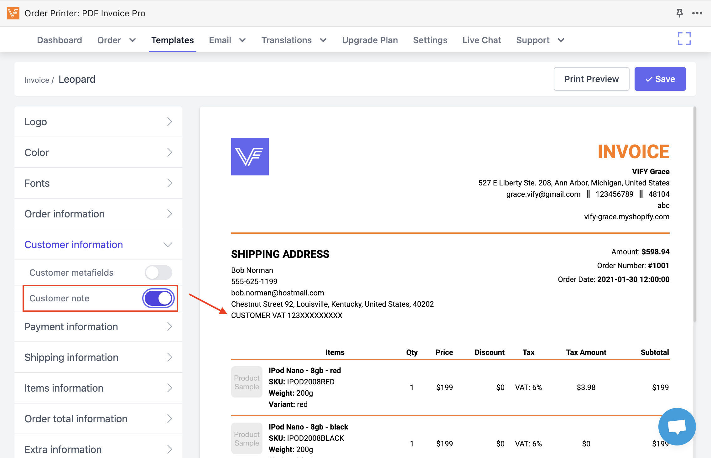 - Customer VAT number (https://support.vify.io/support/solutions/articles/69000451289-display-vat-number-or-any-identification-number-on-invoices)
