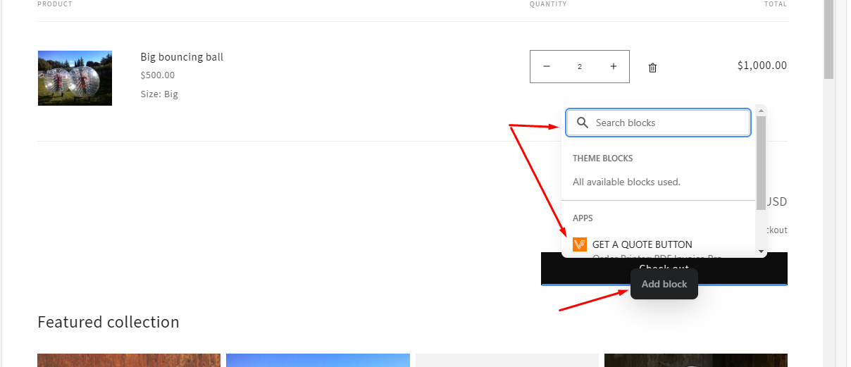 - Step 3: Hover to Checkout button -> plus sign, you would see a Add block button, click on that, then search for Quote button